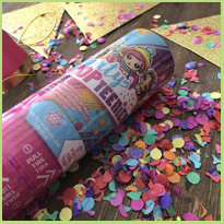 Omdat ik nog geen unboxing van de Party PopTeenies heb bekeken, is het mij in eerste instantie een raadsel hoe het precies werkt. In het pakket wat ik heb ontvangen zitten twee soorten poppers. De Party PopTeenies Dubbele Surprise Popper en zes normale surprise poppers. Ik begin als eerste aan de Dubbele en het gaat gelijk mis. Er staat met grote letters op dat ik het papiertje bovenop er niet af mag halen, maar – knullig en overenthousiast als ik ben – doe ik dat dus wel. Het effect van rondslingerende confetti en slingers doe je hiermee volstrekt teniet. Wees dus niet zo dom als ik en laat het vooral zitten.