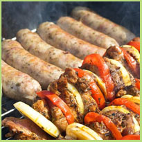 Het meest favoriet zijn hier de “Shaslicks a la Marion”. Dat houdt in: gemarineerde stukjes kipfilet afgewisseld met stukjes ui, paprika, bacon, champignon en bovenaan een cocktailworstje. Maar ook de gepofte aardappels, maiskolven, worsten, hamburgers, spareribs en lamskoteletten vinden hier gretig aftrek.