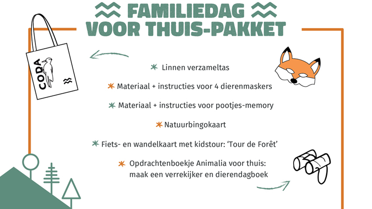 Na het wandelen in de natuur kun je thuis verder aan de slag. De familiedagen van CODA Museum beleef je namelijk deze zomer ook in je eigen huiskamer en met een speciale diereneditie ook op vakantie én in de natuur. Tentoonstelling ‘Animalia’ en de kidstour van de Tour de Forêt komen samen in het familiedag voor thuis-pakket: met (knutsel)opdrachten voor binnen en buiten leren kinderen kijken, vastleggen en vergelijken als een kunstenaar. Koop snel de luxe verrassingsdoos, houd thuis een echte CODA Museum familiedag en beleef de Veluwe!