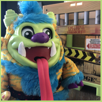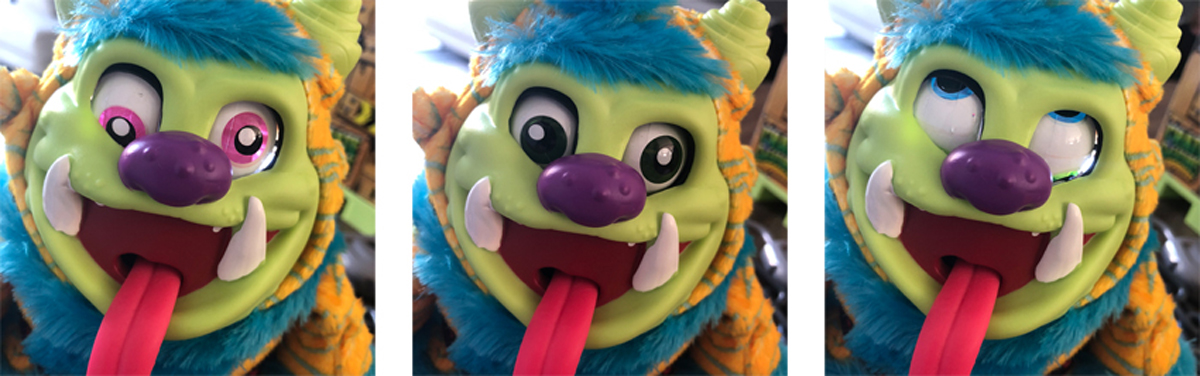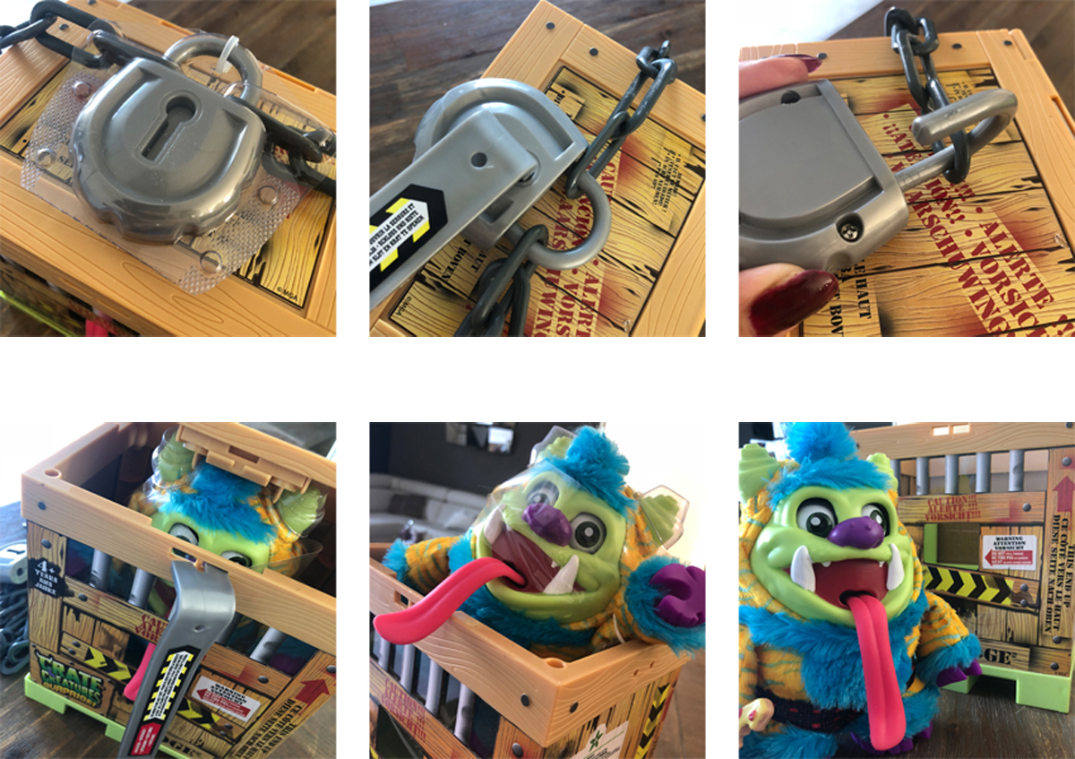 Als je hem aan zijn tong trekt (en die hangt daar echt wel uitnodigend) gaat hij allemaal rare geluiden maken. Je kunt het omschrijven als ‘vieze geluiden’ of ‘ondefinieerbare geluiden’. Maar dit monster kan meer. Je kunt op zijn hoorn drukken en dan gaan ze ogen alle kanten op. Ze gaan zelfs licht geven en als je hem een stukje van zijn pizza geeft, gaat hij deze smakkend opeten.