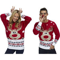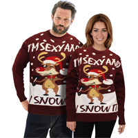 Eigenlijk is deze kersttrui nog helemaal niet zo fout én je kunt er gezellig met “twinnen” met je partner. De trui is uitgevoerd in rood, wit, zwart met een vrolijke Rudolf boven op je buik! De trui is verkrijgbaar tot maat 4L.