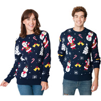 En de laatste alweer, de Happy Christmas. Een vrolijke trui met kerstmannen, sneeuwpoppen en kerstbomen. Geschikt voor mannen en vrouwen en verkrijgbaar tot maat XXXL.