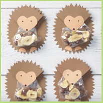 Hoe schattig zijn deze egeltjes! Niet moeilijk te maken en het is ook nog eens een verantwoorde traktatie. Hoewel dat natuurlijk een beetje afhankelijk is van hetgeen je in de kleine zakjes stopt.