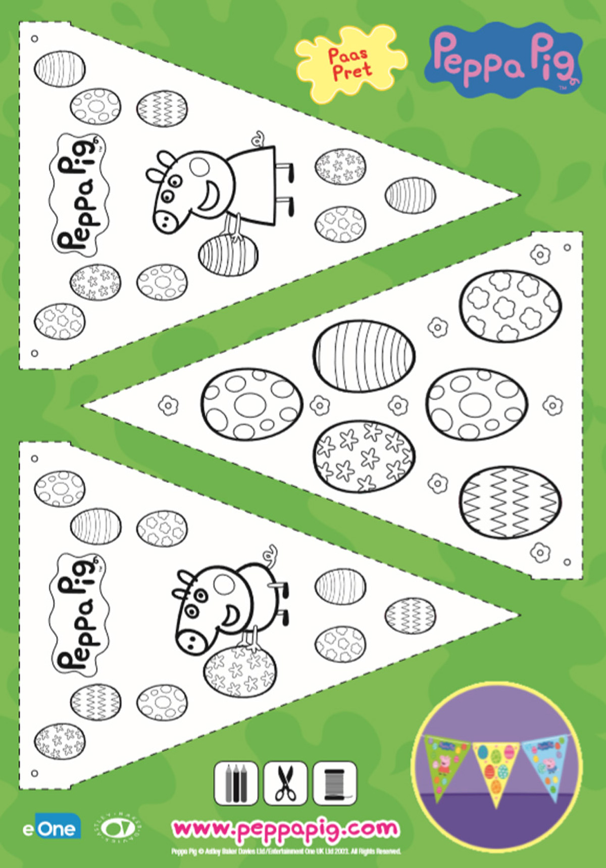 Het is bijna Pasen… Als je het huis nog een beetje meer in Paassfeer wil brengen is deze vrolijke slinger van Peppa misschien leuk om te maken? Je print de vlaggetjes uit en kleuren maar! Hartstikke leuk om met de kids te doen. Je kunt ze natuurlijk volledig versieren naar eigen inzicht: verf, stiften, potloden, glitterstiften, beplakken, stickers, noem maar op.