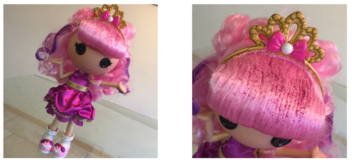 Er wordt van alles meegeleverd bij deze Lalaloopsy pop, zodat je haar nog verder kunt pimpen. Zo is er een spiegeltje, een borsteltje, glitters, een haarkrijtsetje warmee je de roze lokken van de pop kunt omtoveren in paarse, haarspeldjes en een föhn. Het kleuren van de haartjes gaat verbazingwekkend makkelijk. Je pakt een lokje vast en haalt daar het haarkrijtsetje langs. Je ziet de haartjes gelijk verkleuren. Om het effect wat dieper paars te kleuren, kun je dit nog één of twee keer herhalen.