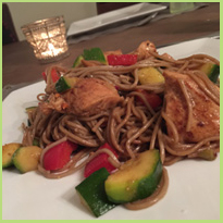 Geglaceerde ketjapkip met pinda-sesambroccoli en noedels