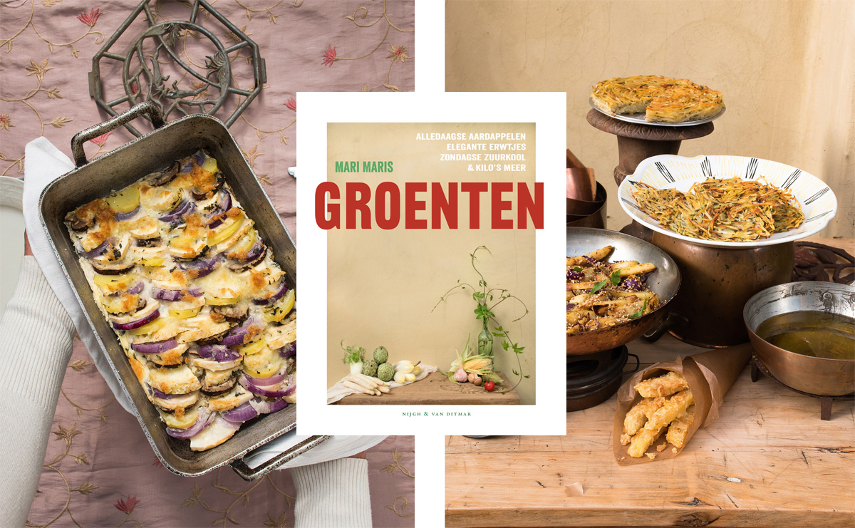 In Mari’s nieuwste boek met de alleszeggende titel GROENTEN vindt u meer dan 800 nieuwe groenterecepten. In ruim 50 overzichtelijke hoofdstukken komen dagelijkse en minder alledaagse groenten aan bod, maar ook wildpluksels, verse kruiden en eetbare bloemen in verrassende recepten van exotisch of Mediterraan tot Pools of Indiaas. Daarbij eindeloze variaties, serveersuggesties, houdbaarheid en verrassende restverwerkingsideeën. De vegan en glutenvrije recepten zijn apart aangegeven. Kortom, ‘Groenten’ is voor iedereen die weleens groenten eet.