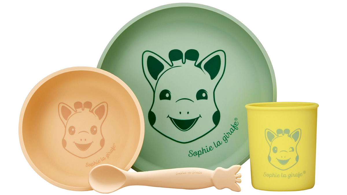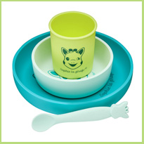De eetsetjes van Sophie de giraf bestaan uit een drinkbeker, kommetje, een handig bordje met opstaande rand en een zachte lepel. Doordat ze van 100% siliconen zijn gemaakt, zijn alle items niet alleen zacht en antislip, maar ook onbreekbaar. Bovendien is alles vaatwasser- en magnetronbestendig. Alle items zijn als set, maar ook gewoon los verkrijgbaar in twee vrolijke kleurencombinaties.