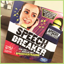 Speech breaker is een spel waarbij je een live verslag moet uitbrengen van iemand die iets doet op een bepaalde plek. Wie, waar en wat, staat op het kaartje wat je eerst moet trekken. De woorden op het kaartje mag je uiteraard niet zeggen. Dat lijkt allemaal heel eenvoudig en als dit het enige zou zijn geweest, dan was het spel ook best eenvoudig, maar ook veel minder hilarisch. Je moet namelijk verslag uitbrengen met de koptelefoon op en de microfoon aan en daar zit nou juist de moeilijkheid. In de microfoon zit namelijk een stemvertrager…