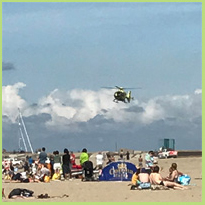 Het duurt een klein kwartiertje, voordat de traumahelikopter er ook aan komt. Het is dus goed mis. De helikopter zoekt een plek om te landen en na nog een aantal minuten zien we dat iemand de helikopter ingaat op een brancard.