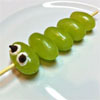 Was de druiven eerst, voordat je ze aan de prikker rijgt. Maak met de koude kaas en de chocolade crisps de oogjes op de voorste druif. Je kunt de oogjes ook maken met een glazuurstift aangezien de kaas allergie gevoelig is. Ter versiering kun je een dienblad bekleden met slabladeren of donkergroen crêpepapier.