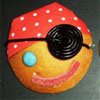 Vouw het servetje om als hoofddoek, strik de dropveter eroverheen en knoop hem aan de achterkant dicht. Maak een mengsel van poedersuiker en een paar druppels water. Dit wordt op deze manier eetbare lijm. Plak hiermee de smarties als oogjes vast, knip een ooglapje uit de dropmat of gebruik een droprol en plak deze over de veter. Als laatste plak je de snoepstengel als mondje op de eierkoek.