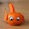 Knip uit het oranje papier voor elke vis een staart (in tweevoud is het makkelijker te bevestigen) en twee vinnen. Teken oogjes op het witte papier en knip deze uit. Teken vervolgens op de vinnen en staart enkele streepjes en vergeet het mondje niet. Je kunt er voor kiezen om de onderdelen met plakband te bevestigen of met een druppeltje knutsellijm. Bekleed ter versiering een dienblad met transparante folie en leg de vissen “te water”.