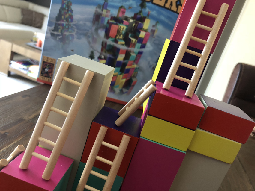 Een tactisch driedimensionaal spel voor kinderen vanaf 8 jaar. Als ik dit spel zie, ben ik direct verliefd. Dit wordt – zeker weten – de komende tijd mijn nieuwe favorietje. Gelukkig delen mijn medespelers mijn mening, zodat de blokken regelmatig op tafel zullen komen. Het spel is zeer fraai uitgevoerd met houten blokken, zodat het lekker lang mee gaat. Bedoeling is naar boven te klimmen, maar daar moet je natuurlijk wel wat voor doen. Je hebt hier ladders voor nodig, want je kunt immers niet vliegen. En dan mag je ook alleen nog maar op de blokken klimmen van je eigen kleur (of op de neutrale blokken).