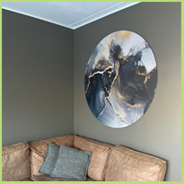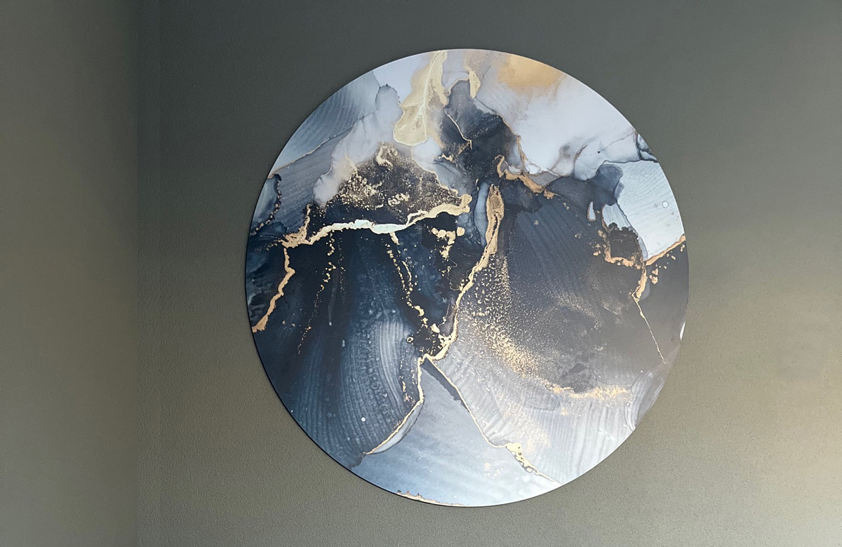 Het zijn geen stickers die je aan de muur hangt, maar de muurcirkels worden gemaakt van Dibond. Dibond is een verzamelnaam voor 2 verschillende materialen samen. De 2 buitenste lagen zijn van aluminium met daartussen een harde laag van polyethyleen. In totaal is de dikte van de muurcirkel slechts 3 mm. De ophangbevestiging voor de muur, wordt meegeleverd.