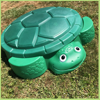 Als je leuk buitenspeelgoed zoekt voor in de tuin, zeg ik: zandbak! Deze groene schildpad zandbak van Little Tikes zit al heel wat jaartjes in de collectie. Jaren geleden hebben wij hem hier al in de tuin gehad voor Rocco en zijn pleegbroertje die toen nog bij ons woonde. De jongens hebben zich enorm vermaakt in deze zandbak. Het prettige is dat deze zandbak kan worden afgesloten met een deksel, zodat de buurtkatten er geen extra kattenbak van kunnen maken. Katten zijn namelijk dol op zand; vooral om in te poepen. In deze schildpad is dat gelukkig niet mogelijk.